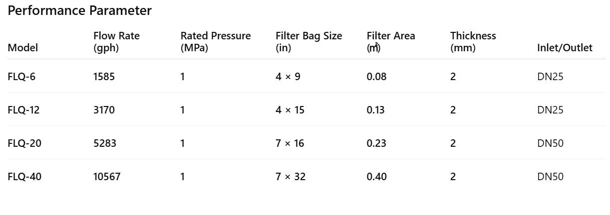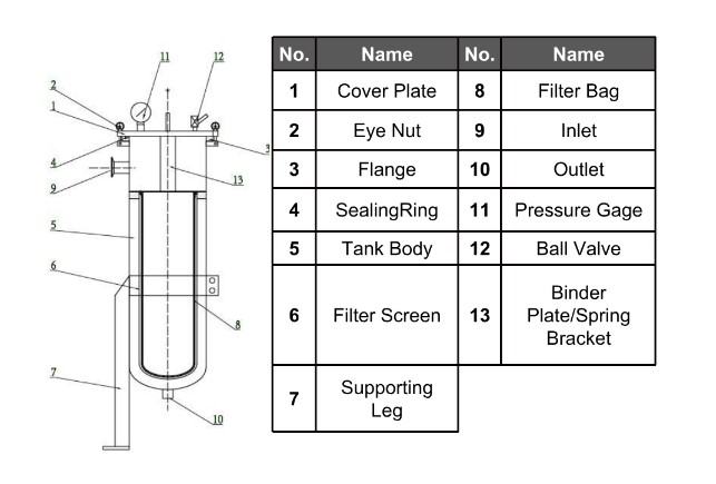The stainless steel single bag filter is a pressure-type filtration device primarily composed of a filter housing, lid, quick-opening clamp mechanism, and stainless steel filter basket. The metal basket supports the filter bag inside the housing. Liquid enters through the inlet, passes through the filter bag, and exits through the outlet as clean, filtered fluid. Solids and impurities are retained inside the filter bag. The bag can be easily replaced or cleaned for repeated use. Installation is straightforward, and filtration requires virtually no consumable materials other than the bag itself.